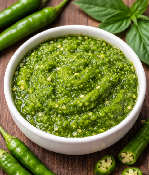 Our Green Chili Purée / Paste is made from freshly harvested, high-quality green chilies known for their Sharp Heat, Natural Aroma, and Vibrant Green Color.